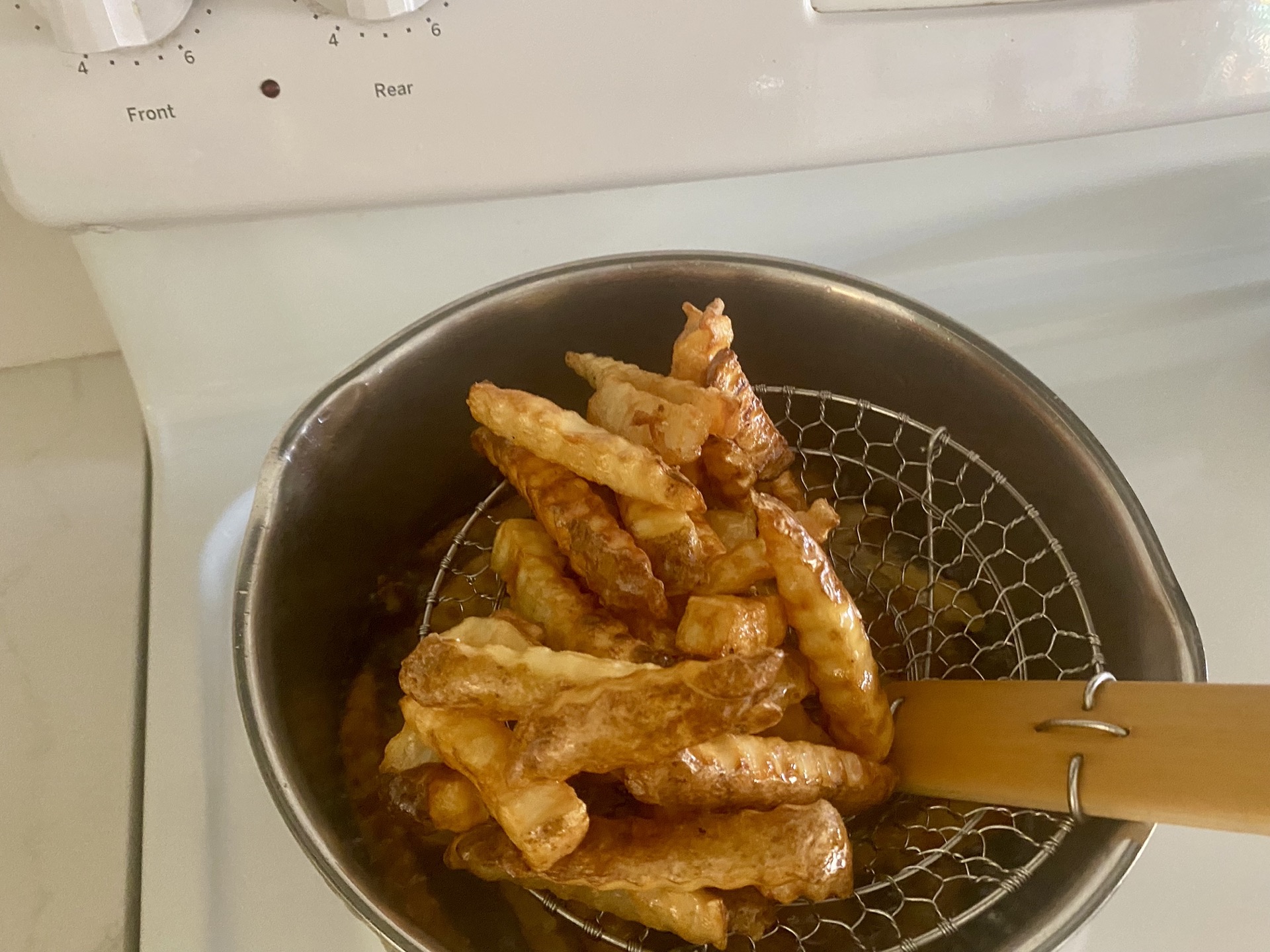 Once your oil is at 380, carefully put about 1 and 1/2 to 2 pounds of fries in your sauce pan. If you’re using frozen fries, make sure to do this a little at a time so it doesn’t boil over and cause a grease fire (if you ever have a grease fire you can throw a bunch of flour on it to smother it, or spray it with a fire extinguisher. Never use water!!!). You can do this with your hands or with a wire metal straining spoon. If you’re using a spoon, place the fries in the spoon, then lower them into the oil and repeat until all the fries are submerged. Let the fries cook until golden brown, stirring occasionally. This will generally take about 8 minutes.